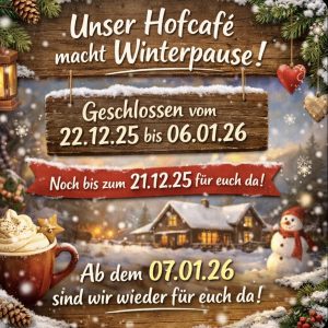 Das Jahr neigt sich dem Ende zu und auch wir gönnen uns eine kleine Winterpause. Unser Hofcafé bleibt daher vom 22.12.2025 bis einschließlich 06.01.26 geschlossen.